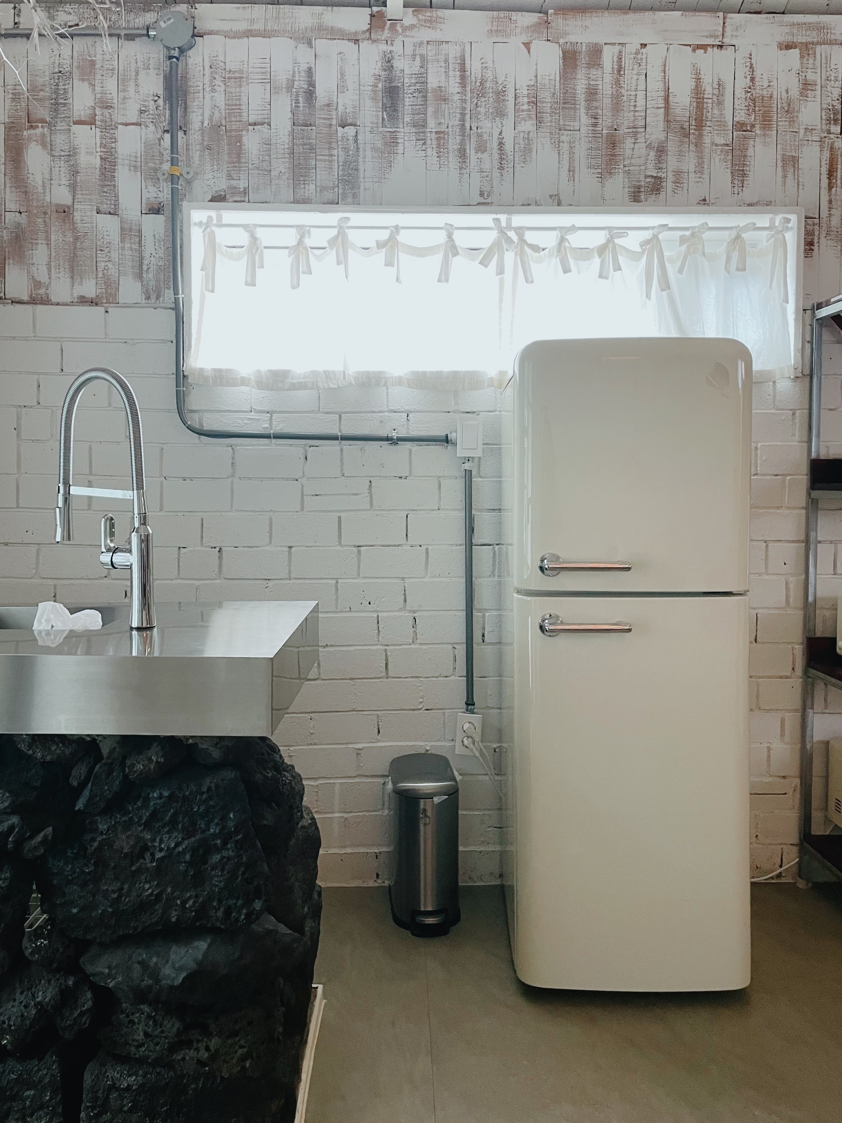 현무암으로 쌓은 아일랜드 식탁이 아름다운 부엌에도 살림들이 미니멀하지만 꼼꼼하게 갖춰져 있었다. 냉장고에 스티커가 어렵게 떼인 자국이 보이는 걸 보니 수고롭게 기꺼이 뗀 것이 확실하다. 나도 그 에너지 등급 표시 스티커가 주는 연두와 주황색에게 피로감을 느끼는 사람이라서, 이 디테일의 취향이 마음에 쏙 들었다.