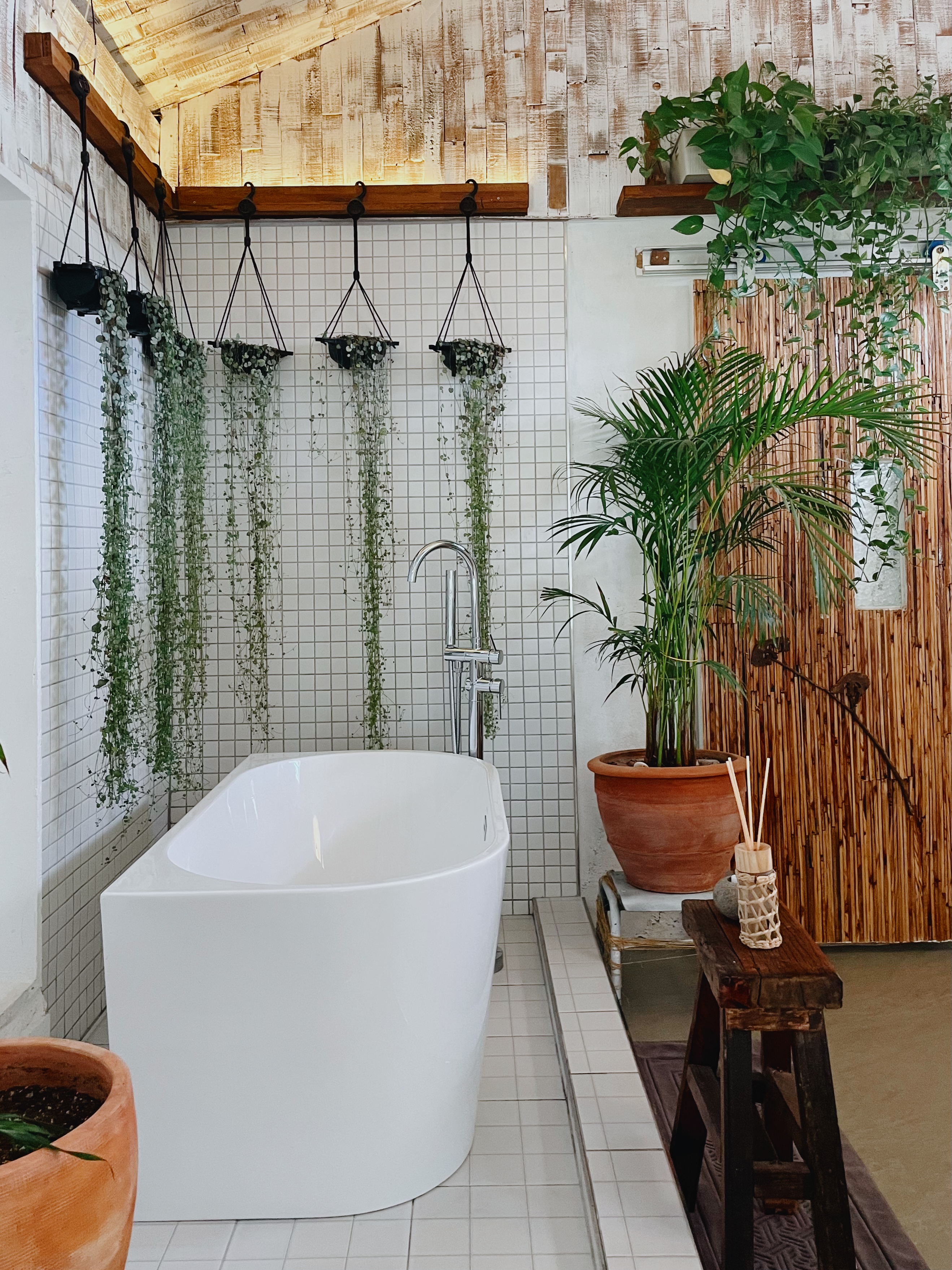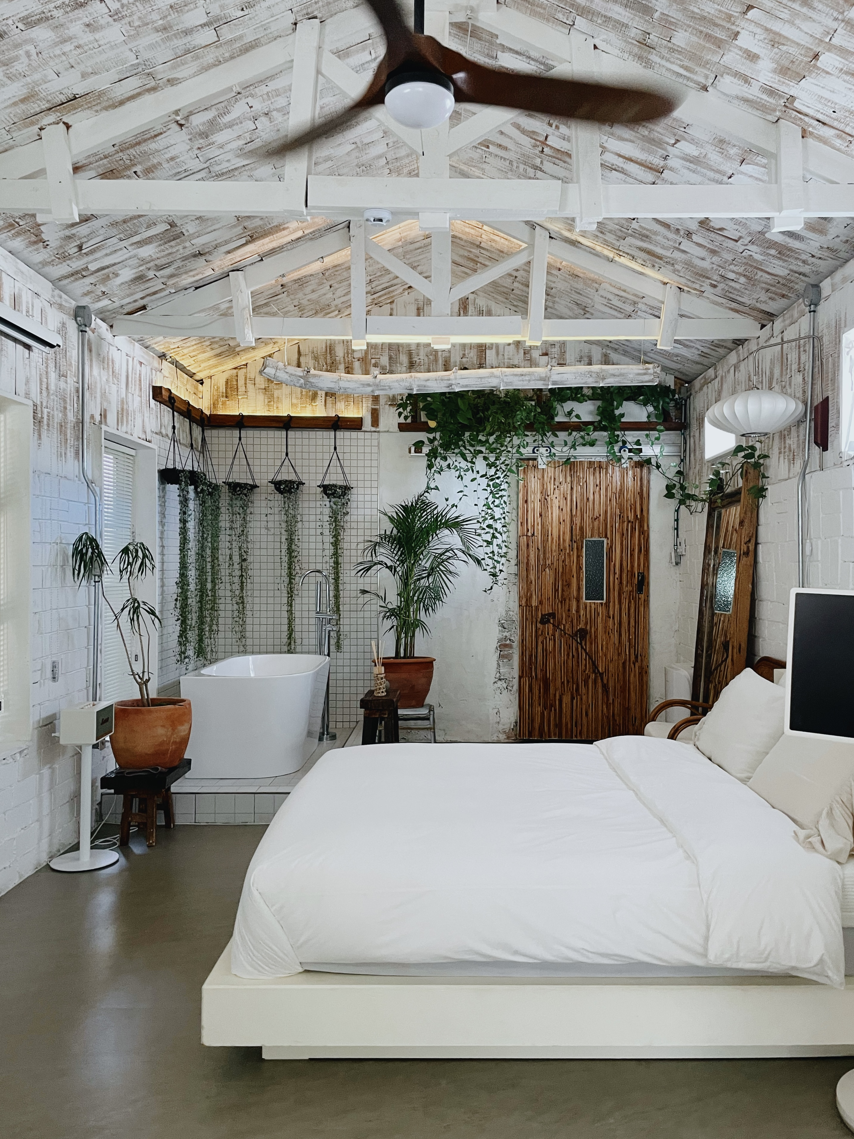 그럼에도 불구하고 감각이 이루 말할 수 없이 압도적이다. 사진으로는 조악한 조화들로 어색한 공간일까봐 걱정했는데 이분들 대체 뭐하는 분들인고 싶게 식물들이 전부 살았다. 침실 곁의 욕조와 쾌적함 이상으로 넓은 욕실도 인상적이었다. 제주란 도시의 쉼의 공간에서 씻는 행복을 누리도록 배려로 설계된 게 아닌가 싶어서, 디테일을 따지고 관철시킨 호스트의 마음이 엿보였다.