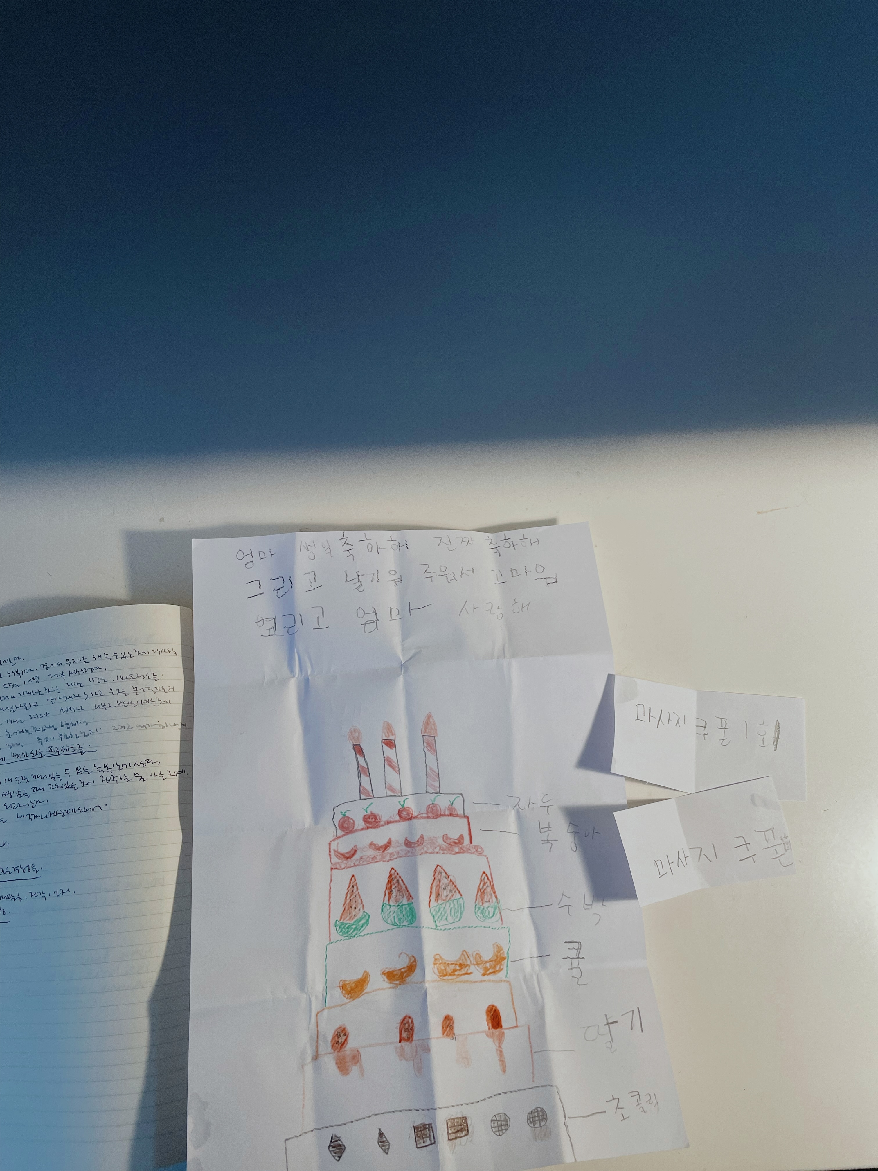 저녁에 루다가 내 생일이라고 흰 종이에 과일 7단 케이크 그리는 거 감상하다가 젤이 볼에 뽀뽀 여러번 해줬다. 한젤이 어깨허리 종아리 마사지 해주고, 한젤이가 내 어깨 종아리 마사지 해주는 거 꿀처럼 받았다. 잠이 솔솔 온 젤이가 방으로 안 가고 머물길래 같이 잘까? 했더니 웬걸 그러겠다 하길래 오랜만에 셋이 한자리에 누워 잠들었다. 감동이 몽글몽글 차오르다가도 아들들 힘 들어가 묵직한 팔꿈치랑 허벅지가 달려드면 반사적으로 피하는 피로한 밤을 지났다. 생일도 끝났다. 특별한 게 없는데 뭔가 충분히 행복한 그런 날로 기억되겠구나. 행복은 그저 느끼는 상태라고 했다. 오늘 누린 평범한 일상, 일상, 일상 … 이 일상의 막강한 힘에 대해 생각한다.